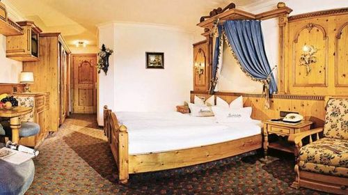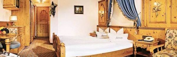 elegancki hotel. Budynek główny i boczny (oddzielone parkingiem, połączone podziemnym przejściem). W budynku głównym: hall z barem, izby tyrolskie i sale restauracyjne (dla niepalących). Winda. Parking. Garaż w cenie (mało miejsc, bez możliwości rezerwacji). Można przywieźć psa (30 €/pobyt, wymagane zgłoszenie). 40 pokoi.