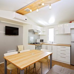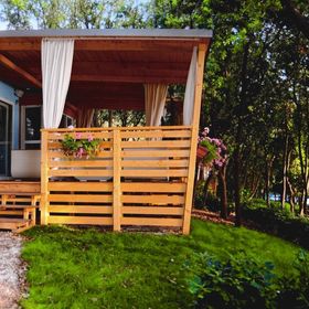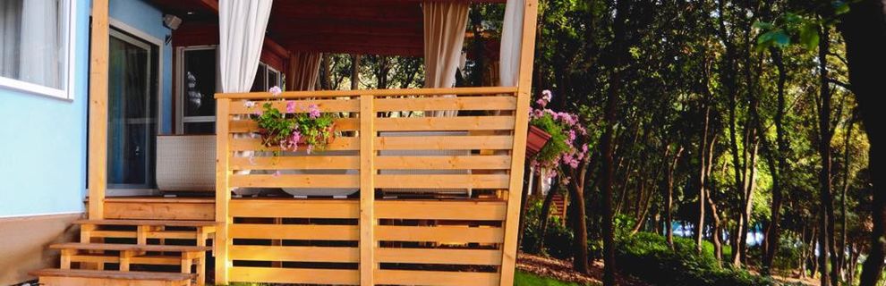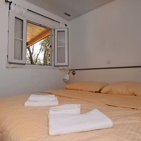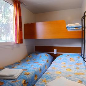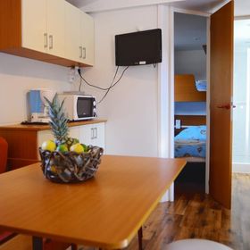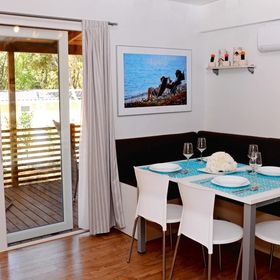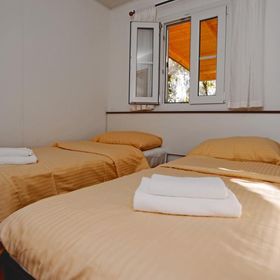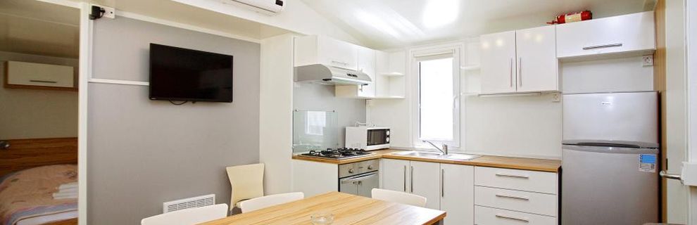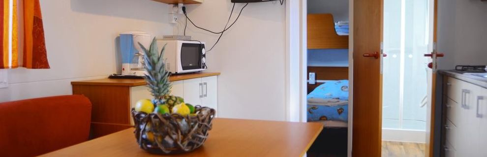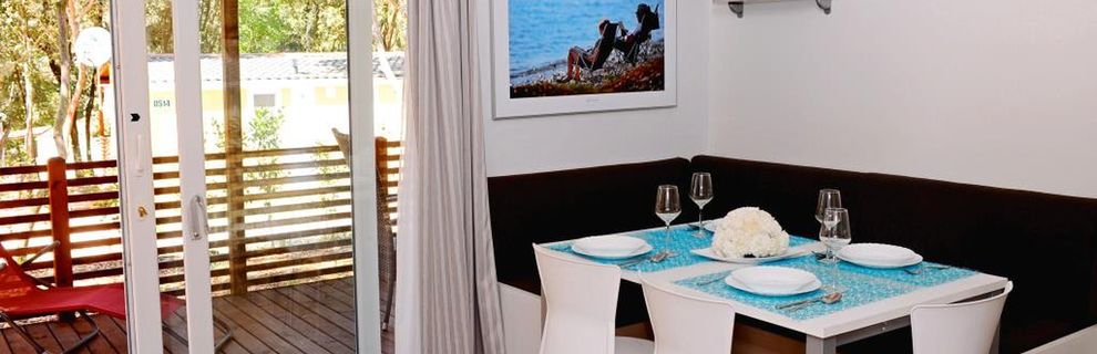 prysznic, WC, klimatyzacja, TV-sat., taras. Wnęka kuchenna (kuchenka, kącik do spożywania posiłków, k.mikrofalowa, ekspres do kawy, czajnik, toster, lodówka z zamrażarką). F4F: 3-pokojowy mobile home dla 4 os. "Comfort" (ok. 24 m kw.). F4G: 3-pokojowy mobile home dla 4 os. "Deluxe" (ok. 32 m kw.). F4H: 3-pokojowy mobile home dla 4 os. "DeluxePlus" (ok. 32 m kw.). F4J: 3-pokojowy mobile home superior dla 4 os. "Prestige" (ok. 40 m kw.). F4K: 3-pokojowy mobile home superior plus dla 4 os. "Prestige" (ok. 40 m kw.) z widokiem na morze. F4L: 3-pokojowy mobile home dla 4 os. "Prestige" (ok. 50 m kw.) z widokiem na morze.