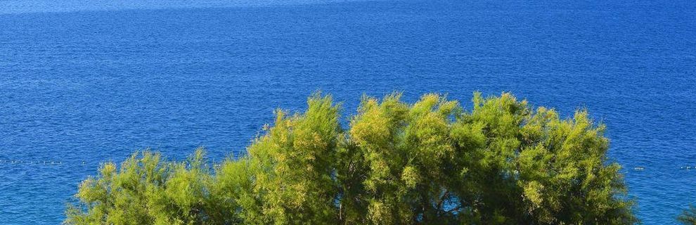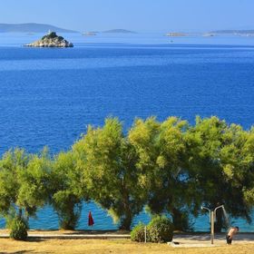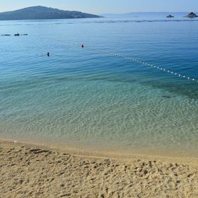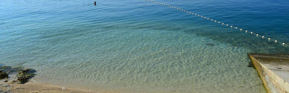 Plaża kamienista/skalna/z utwardzoną nawierzchnią, posiadająca prysznice, kabiny i bar plażowy.