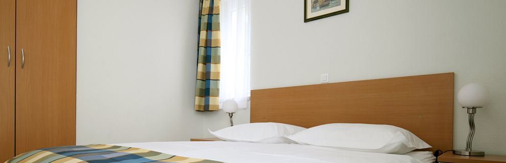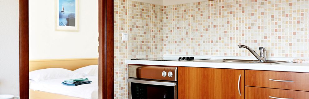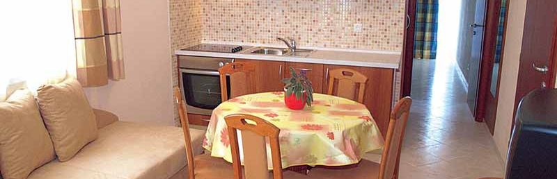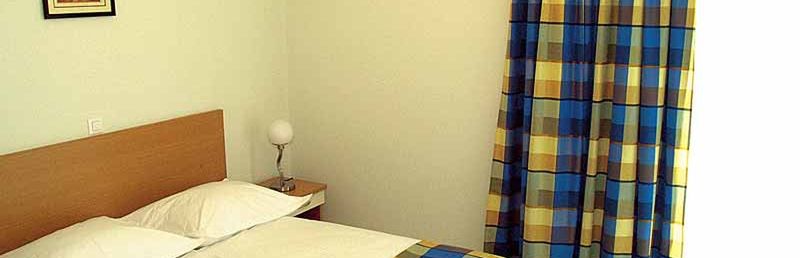 dobrze wyposażone, z telefonem, TV-SAT, podłączeniem do internetu, klimatyzacją, sejfem, kącikiem jadalnym i wnęką kuchenną (2-płytowa kuchenka elektryczna, lodówka, ekspres do kawy). Prysznic, WC, suszarka i balkon. Dwupokojowe mieszkanie dla 3 dorosłych (ok. 30 m kw.). Pomieszczenie mieszkalno-sypialne z miejscem do spania. Pokój dwuosobowy.