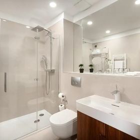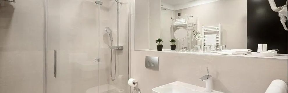 Łazienka z prysznicem, suszarką i kosmetykami