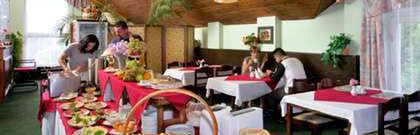Bufet śniadaniowy. Wieczorem wybór menu. Na życzenie i za wcześniejszą rezerwacją kuchnia wegetariańska i dietetyczna.