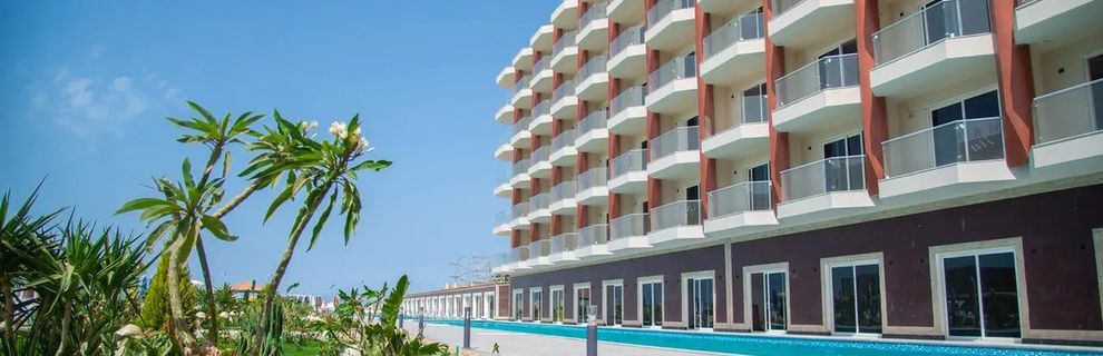 Hotel położony jest bezpośrednio przy prywatnej, piaszczystej plaży, co zapewnia wygodny dostęp do morza i możliwość wypoczynku tuż przy brzegu.