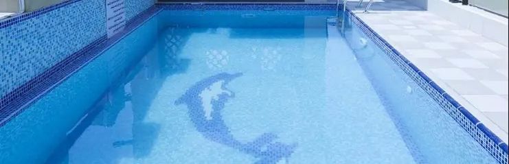 Odkryty basen na dachu z widokami na panoramę miasta.