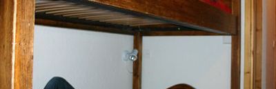 Chalet 4/7 - samodzielny apartament dla 4/7 osób (45 m2) składający się z pokoju dziennego z rozkładaną kanapą dla 2 osób, całkowicie wyposażonej kuchni, WC na parterze oraz 1 sypialni z łóżkiem małżeńskim oraz dużej sypialni dla 4 osób z 2 łóżkami piętrowymi, łazienki, WC i balkonu na 1 piętrze.