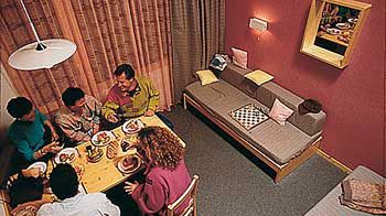 Mieszkanie urządzone rustykalnie według gustu właściciela. Wszystkie z kącikiem kuchennym (kuchenka, lodówka, od 4 os. również zmywarka). Miejsce do jedzenia, łazienka, WC (od 4 os. WC oddzielne), balkon. Mieszkanie jednopokojowe dla 3 osób (ok. 20 m kw.). Pomieszczenie mieszkalno-sypialne z 2 pojedynczymi łóżkami i 1 łóżkiem rozkładanym. Prysznic, WC. Mieszkanie jednopokojowe dla 4 osób (ok. 28 m kw.). Pomieszczenie mieszkalno-sypialne z 4 łóżkami oddzielonymi suwanymi drzwiami. Łazienka, oddzielne WC. Mieszkanie dwupokojowe dla 5 osób (ok. 30 m kw.). Pomieszczenie mieszkalno-sypialne z 3 łóżkami. 1 pokój z dwoma łóżkami. Łazienka, oddzielne WC. Mieszkanie dwupokojowe dla 6 osób (ok. 35 m kw.). Sypialnia z 2 łóżkami. 2 lóżka w pomieszczeniu mieszkalnym. 2 łóżka w kąciku jadalnym. 1 lub 2 łazienki, oddzielne WC. Mieszkanie trzypokojowe dla 8 osób (ok. 48 m kw.). 2 pokoje dwuosobowe z 2 pojedynczymi łóżkami. 4 miejsca do spania w pomieszczeniu mieszkalnym. 2 łazienki z WC. Mieszkanie dwupokojowe dla 6 osób (ok. 39 m kw.). Sypialnia z francuskim podwójnym łóżkiem, wnęka sypialna z łóżkiem piętrowym, kącik w pomieszczeniu mieszkalnym z dwoma łóżkami. 2 łazienki, WC. W nowym budynku na początku miejscowości. Mieszkanie trzypokojowe dla 7 osób (ok. 46 m kw.). Sypialnia z francuskim podwójnym łóżkiem. Sypialnia z łóżkiem piętrowym. Kącik w pomieszczeniu mieszkalnym z 2 łóżkami i 1 łóżkiem rozkładanym. 2 łazienki, WC. W nowym budynku na początku miejscowości.