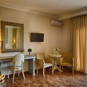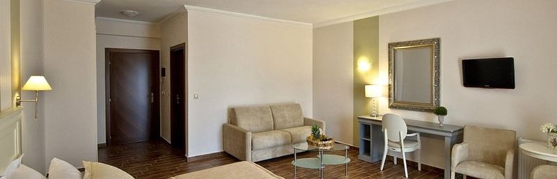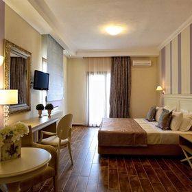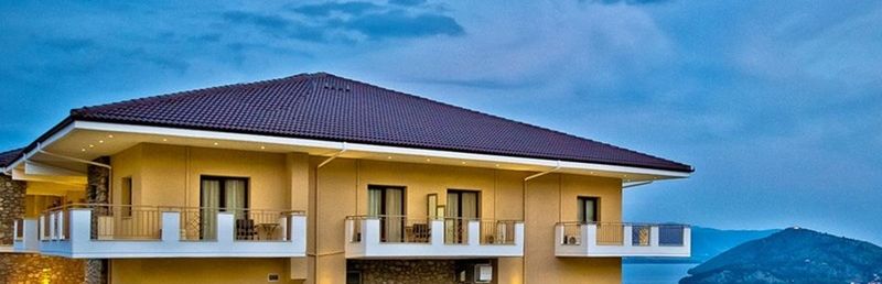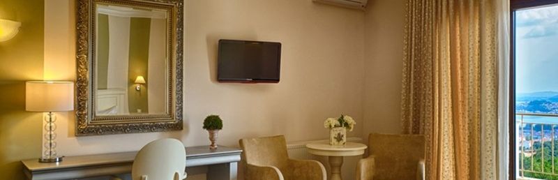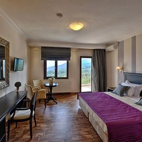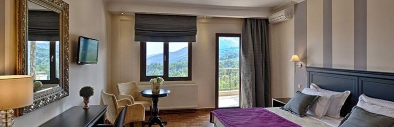 Kameralny, trzypiętrowy przytulny hotel, z którego rozciąga się widok na jezioro Orestiada i na las.