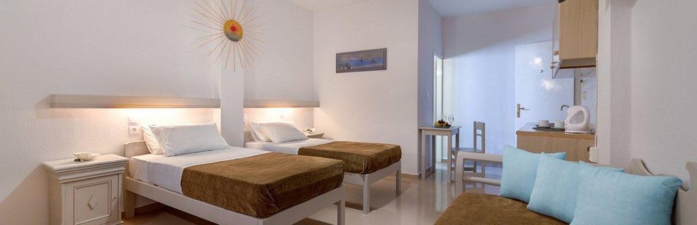 Studia dwuosobowe z możliwością jednej dostawki. Pokoje typu studio oferują wszystkie standardowe udogodnienia, a także komfort większej przestrzeni, ponieważ mają około 20-25 m i są idealne na przyjęcie 2 lub 3 osób (na życzenie). Możesz wybrać pomiędzy łóżkiem podwójnym i dwoma łóżkami pojedynczymi. Ponadto w pokojach typu studio dostępny jest w pełni wyposażony aneks kuchenny. Prywatny balkon na zewnątrz pozwala odpocząć i cieszyć się widokiem na okolicę.