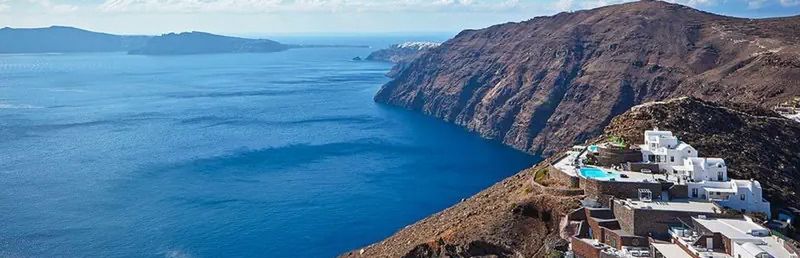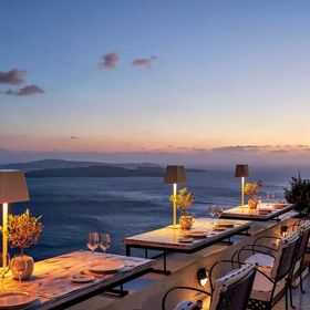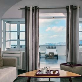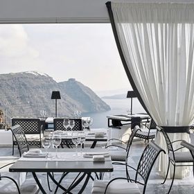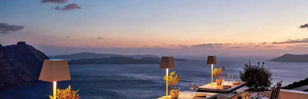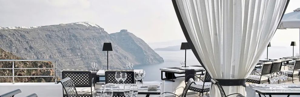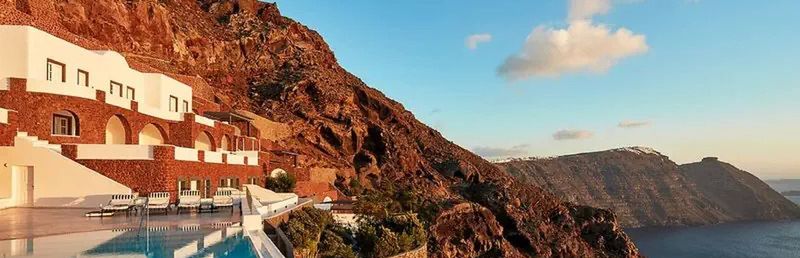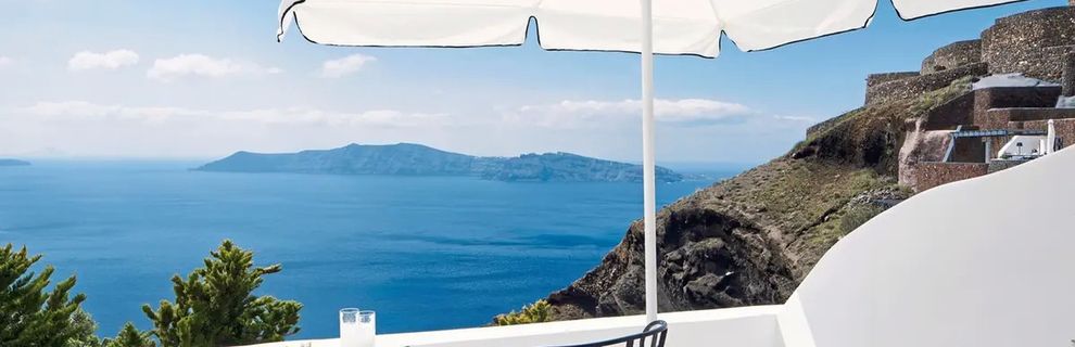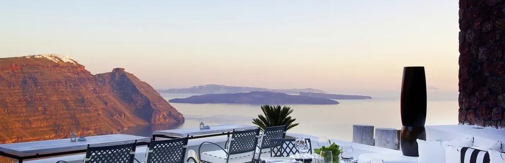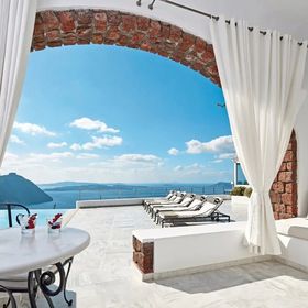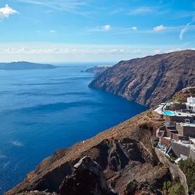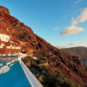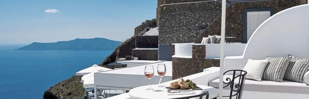 Hotel znajduje się w miejscowości Imerovigli, na klifie z wyjątkowym widokiem na morze i kalderę.