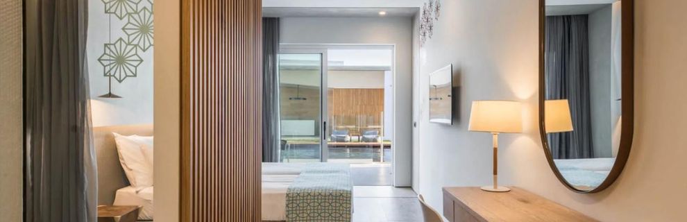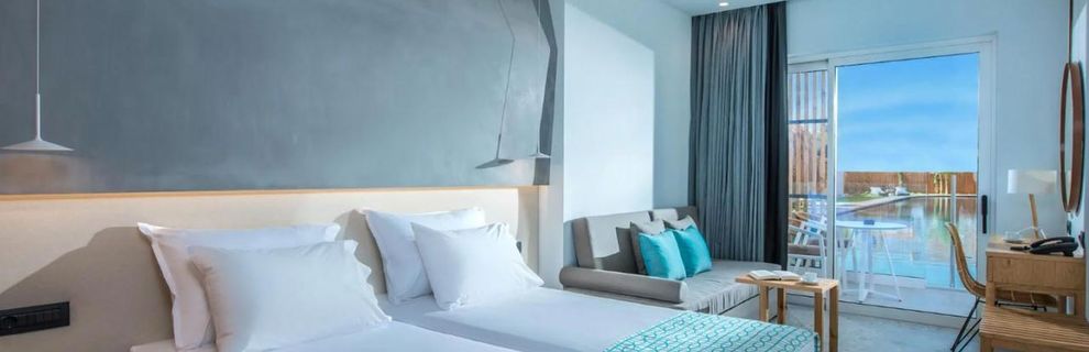 * Junior Suite Swim - apartament typu swim up o powierzchni 26 m2 (maksymalnie 3 osoby dorosłe) z jednym łóżkiem podwójnym lub 2 łóżkami pojedynczymi i 1 dodatkowym łóżkiem. W wyposażeniu pokoju: telewizja satelitarna smart i IP 43'', bezpłatny dostęp do szybkiego Wi-Fi, sejf, telefon, prywatny prysznic, suszarka do włosów, klimatyzacja (indywidualnie sterowana, ogrzewanie-chłodzenie), ręczniki plażowe, balkon lub taras, zestaw do parzenia kawy i herbaty, mini lodówka, sprzęt do prasowania (na życzenie), kreteński pakiet powitalny, kosmetyki, szlafrok i kapcie.