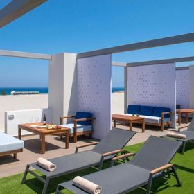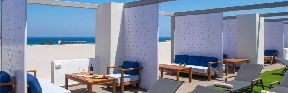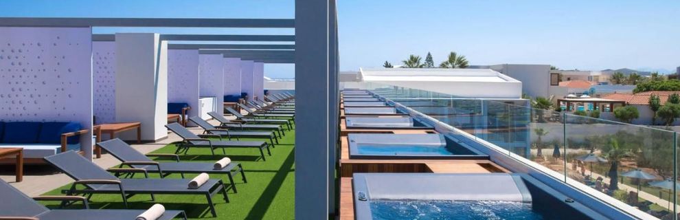 * Junior Suite Roof Garden & Jacuzzi - apartament o powierzchni 26 m2 z ogrodem na dachu z jacuzzi (maksymalnie 3 osoby dorosłe) z jednym łóżkiem podwójnym lub 2 łóżkami pojedynczymi i 1 dodatkowym łóżkiem z wyposażeniem i usługami o podwyższonym standardzie. W wyposażeniu pokoju: telewizja satelitarna smart i IP 43'', bezpłatny dostęp do szybkiego Wi-Fi, sejf, telefon, prywatny prysznic, suszarka do włosów, klimatyzacja (indywidualnie sterowana, ogrzewanie-chłodzenie), ręczniki plażowe, balkon lub taras, zestaw do parzenia kawy i herbaty, mini lodówka, sprzęt do prasowania (na życzenie), kreteński pakiet powitalny, kosmetyki, szlafrok i kapcie.