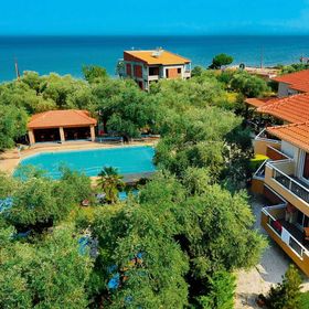Położenie hotelu ok. 200 metrów od morza. Dwa budynki położone w pewnym oddaleniu od drogi głównej prowadzącej przez wieś, tak więc cicho i spokojnie. Bardzo sympatyczne miejsce na śniadania - stoły ustawione pomiędzy drzewami oliwnymi.