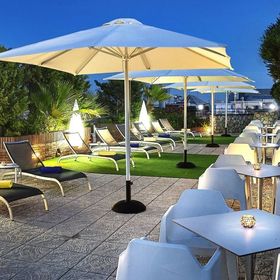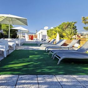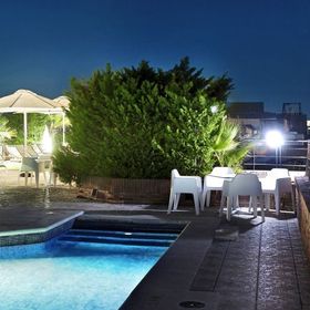 Zewnętrzny basen z tarasem na dachu, otoczony leżakami i parasolami.