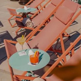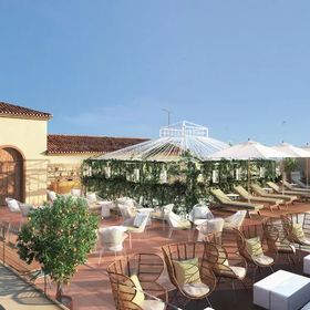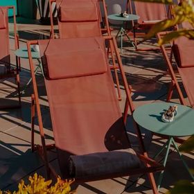 Sezonowy basen na dachu z panoramicznym widokiem, otoczony słonecznym tarasem z bezpłatnymi parasolami i leżakami.