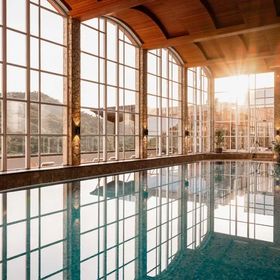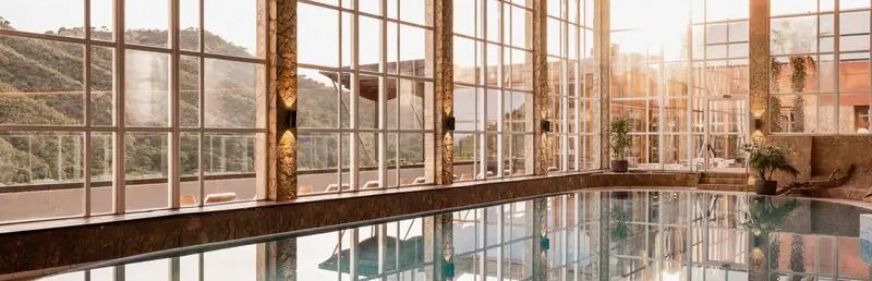 Oferuje 3 baseny, w tym brodzik łączony z basenem głównym oraz brodzik odkryty.