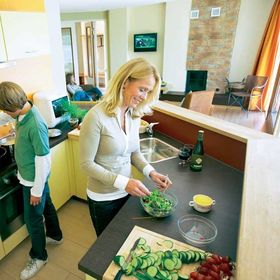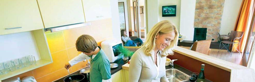 pokój dzienny, kominek, TV, radio, kuchnia (kuchenka, lodówka, ekspres do kawy, k. mikrofalowa, toster). Wanna, WC. Umeblowany taras. F2F/G2F/H2F: m. jednopokojowe dla 2 os. (ok. 26 m kw). Pokój dzienny z 2 pojedynczymi łóżkami. F4F/G4F/H4F: m. trzypokojowe dla 4 os. (ok. 54 m kw). 2 pokoje 2-os. F6F/G6F/H6F: m. czteropokojowe dla 6 os. (ok. 59 m kw). 2 pokoje 2-os. 1 pokój z łóżkiem piętrowym. F6G/G6G/H6G: m. czteropokojowe dla 6 os. (ok. 54 m kw). 2 pokoje 2-os. 1 pokój z łóżkiem piętrowym. F8F/G8F/H8F: m. pięciopokojowe dla 8 os. (ok. 86 m kw). 4 pokoje 2-os.