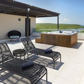 Gość ma do dyspozycji rozległy basen zewnętrzny, aquapark dla dzieci, brodzik, 2 jacuzzi i leniwą rzekę, a przy basenach bezpłatnie dostępne są leżaki i parasole.