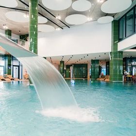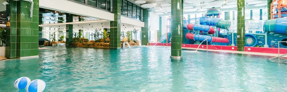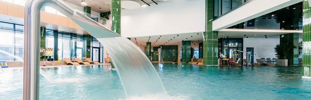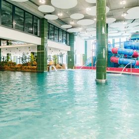 Gość ma do dyspozycji basen zewnętrzny, brodzik oraz dostęp do dużej strefy aquaparku z licznymi atrakcjami wodnymi.