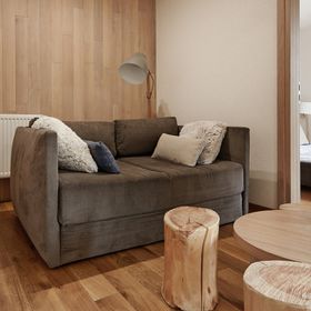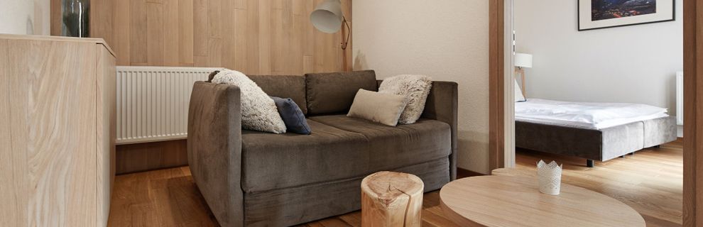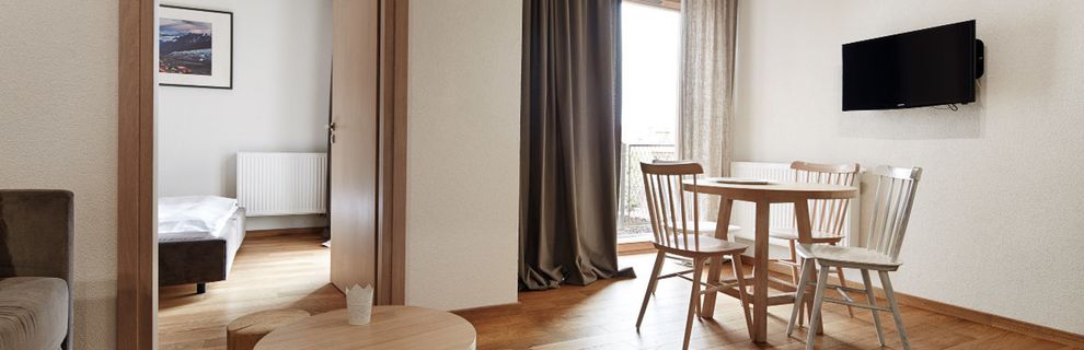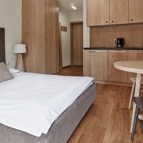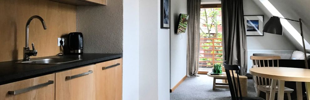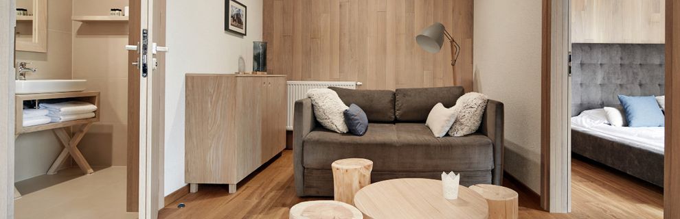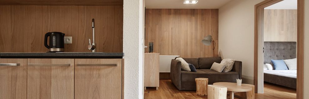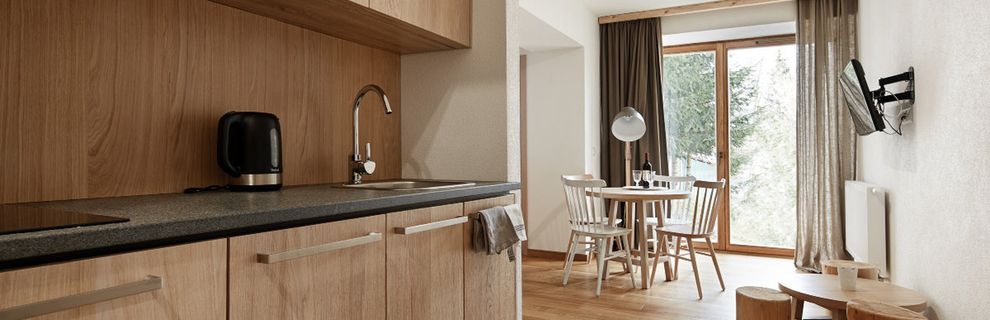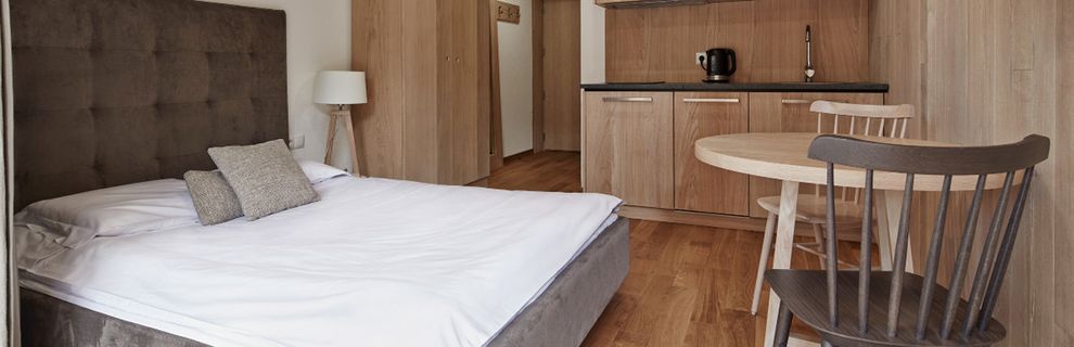 Pokoje są urządzone wygodnie i funkcjonalnie - dominują drewno oraz jasne barwy. Część pomieszczeń znajduje się na poddaszu i pozwala poczuć dodatkowy klimat mieszkania w góralskiej chacie. Pokoje posiadają prywatne łazienki, balkony z częściowym widokiem na góry oraz w pełni wyposażone aneksy kuchenne (lodówka, kuchenka mikrofalowa, przybory kuchenne, czajnik elektryczny, zmywarka, płyta kuchenna z okapem, krzesełko dla dziecka). W pokoju znajduje się telewizor z płaskim ekranem, szafa lub garderoba, stół, drewniana podłoga lub parkiet przyjazny alergikom, ogrzewanie, pościel, gniazdko koło łóżka, wieszak na ubrania.