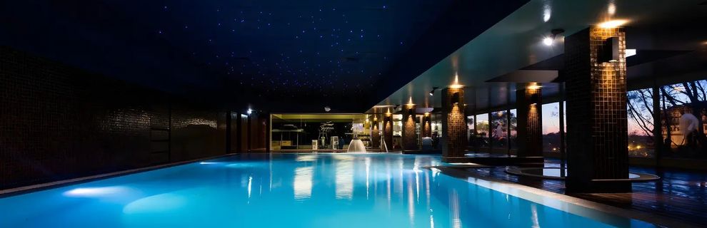 Kryty podgrzewany basen z nieregularnym kształtem, jacuzzi i sauna. Ręczniki dostępne za depozytem.