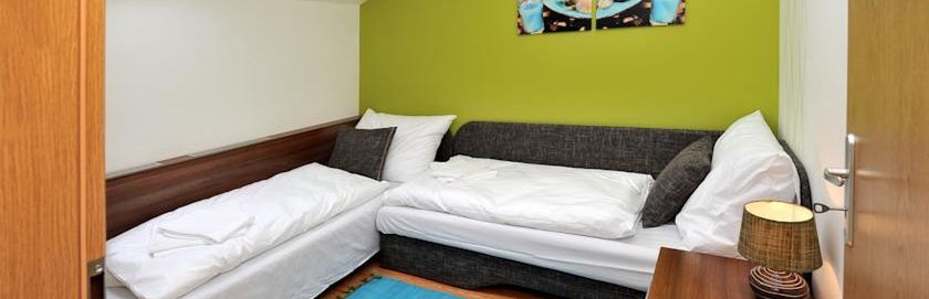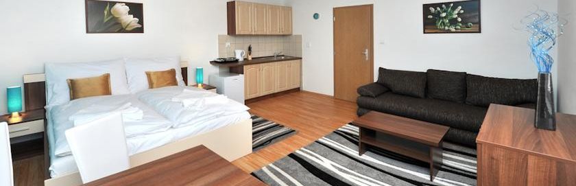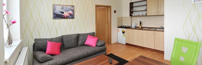 w studiach i apartamentach - wszystkie z łazienką (prysznic), TV/Sat i aneksem kuchennym. STUDIO 2-osobowe z możliwością 2 dostawek (rozkładany wypoczynek) - jedno pomieszczenie; APARTAMENT 3-osobowy z możliwością 2 dostawek - sypialnia z łóżkiem małżeńskim i pojedynczym oraz pokój dzienny z rozkładanym wypoczynkiem dla 2 osób (dostawka); APARTAMENT 4-osobowy z możliwością 2 dostawek - 2 sypialnie 2-osobowe oraz pokój dzienny z rozkładanym wypoczynkiem dla 2 osób.