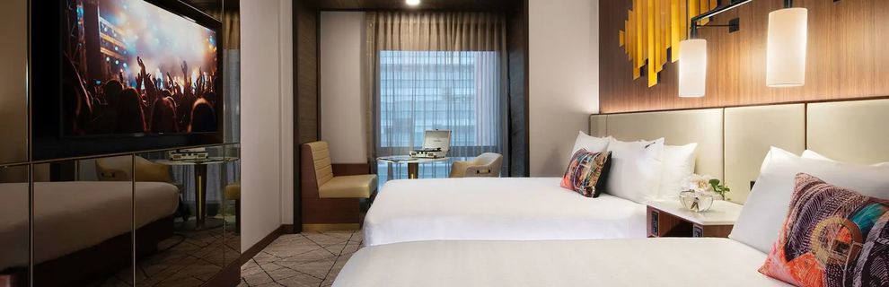 Zanurz się w żywiołowym klimacie Nowego Jorku w Hard Rock Hotel New York. Hotel, zaprojektowany przez Jeffrey Beers International, zyskał uznanie dzięki unikalnemu designowi i legendarnym pamiątkom, które oddają hołd nowojorskiej scenie muzycznej. Od restauracji i baru, gdzie żywe występy uchwycają duszę miasta, po zapierające dech w piersiach widoki oraz mistrzowsko skomponowane koktajle w RT60 Rooftop Bar & Lounge - każda chwila to niezapomniane przeżycie. Odkryj niezrównane przestrzenie eventowe, delektuj się muzycznymi udogodnieniami, i odpocznij w jednym z naszych 446 pięknie zaprojektowanych pokoi i apartamentów z oknami od podłogi do sufitu, które ukazują energię miasta. Zaledwie kilka kroków od ikon, takich jak Broadway i Rockefeller Center, hotel zaprasza Cię do zanurzenia się w tętniącym życiem centrum Midtown Manhattan i odkrycia niezrównanego uroku Hard Rock Hotel New York.