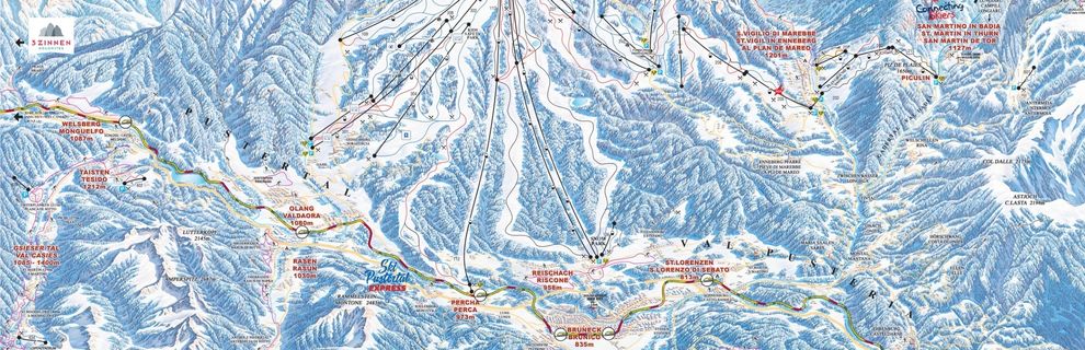 Korzystając z karnetu "Kronplatz" mamy do dyspozycji 119 km z szczytem na wysokości 2275 m. Trasy o łącznej dł. 119 km i 32 nowoczesne wyciągi na wysokości od 973 do 2275 m troszczą się o niezapomniane narciarskie przeżycia zarówno wśród początkujących, jak i zaawansowanych narciarzy. Rodzinom i początkującym narciarzom szczególnie polecamy 8-osobową gondolę "CroniExpress". Udostępnia ona trasy o szerokości 100 m i różnicy wysokości 160 m. Na szycie Kronplatz znajduje się "Croniworld", gdzie rodzice mogą obserwować postępy swoich pociech oraz podziwiać przepiękne górskie widoki.Doświadczeni narciarze mogą dowieść swych umiejętności i doświadczenia na dwóch stromych zjazdach "Sylvester" i "Herrnegg". Tak i w dzień tak i w nocy można korzystać z tych obu tras, gdyż są one oświetlone.