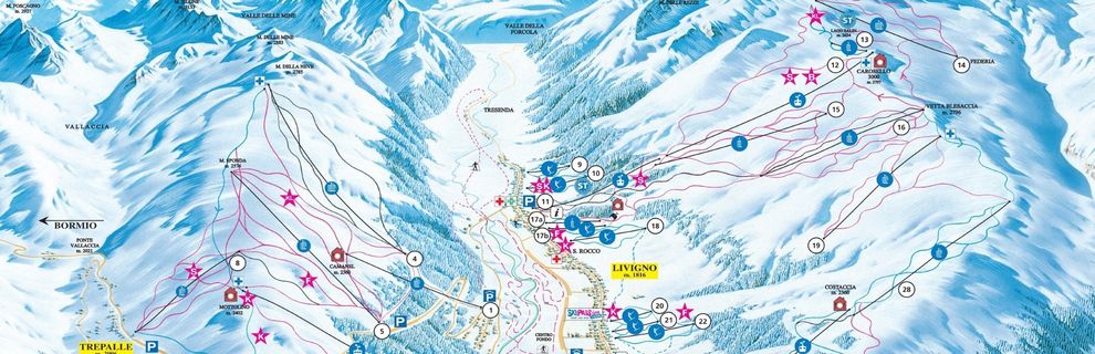 115 km tras zjazdowych, 31 wyciągów i cudownie szerokie stoki - to wszystko oferuje Państwu karnet narciarski Livigno! Dzięki położeniu na wysokości 1816 - 2798 m i licznym urządzeniom naśnieżającym panują na tym terenie idealne warunki narciarskie.Trasy rozciągają się po obu stronach doliny, możecie więc Państwo zawsze cieszyć się słońcem. Freeriderzy mają tu wiele możliwości jazdy w głębokim śniegu po stronie Carosello. Snowparki przy Mottolino jak i Carosello z halfpipe, skoczniami, rails i boardercross'em - wszystko to czyni Livigno prawdziwym rajem dla snowboardzistów. Dzięki fun-parkom Livignio stało się miejscem rozgrywania międzynarodowych zawodów! Jedną z nielicznych czarnych tras narciarskich jest Monte Neve-Valfin. Poza tym w regionie przeważają łatwe i średniej trudności trasy. W pobliżu miejscowości znajdują się stoki do ćwiczeń dla początkujących narciarzy. Do dyspozycji dzieci jest przedszkole narciarskie i dużo terenów, które położone są w różnych lokalizacjach na obrzeżach Livigno.