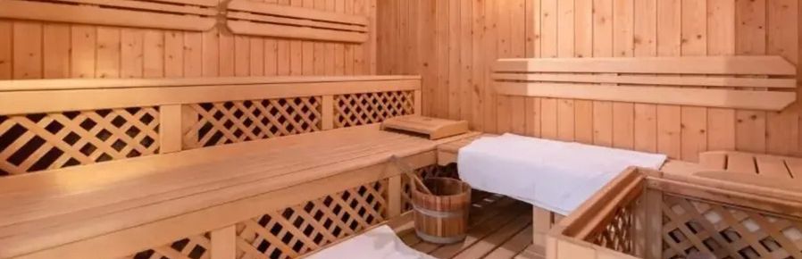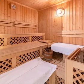 Strefa wellness obejmuje łaźnię parową, saunę i pokój relaksacyjny.