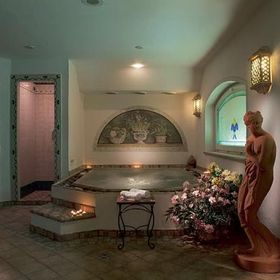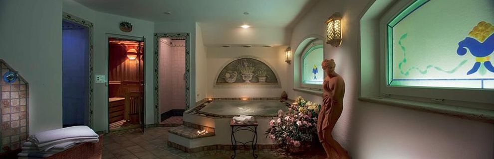 sauna fińska, łaźnia parowa, whirlpool, podgrzewany basen (16 x 6 m), leżaki i parasole przy basenie.