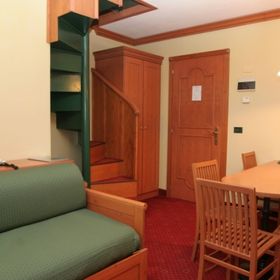 Apartament trilo 6-osobowy (ok. 40 m2) dwupoziomowy, składa się z 2 sypialni na piętrze (łóżko małżeńskie, łóżka pojedyncze), na parterze pokój dzienny z 3 miejscami do spania (możliwe również łóżko piętrowe) i aneksu kuchennego w pełni wyposażonego (naczynia, sztućce, kuchenka, lodówka). Łazienka z WC, telefon i TV, balkon.