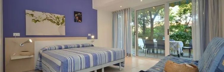 Apt. 4+2 C1-6: apartament TRILO na parterze dla 4-6 osób, 2 sypialnie jedna z łóżkiem małżeńskim druga łóżkiem piętrowym lub 2 łóżkami pojedynczymi (sypialnie "oddzielone" szafą), pokój dzienny z rozkładaną sofą dla 2 osób, aneks kuchenny, prysznic/wanna, WC, duży częściowo zadaszony taras z markizą lub taras z dostępem do ogrodu.