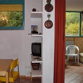 (ok. 40 m2), składa się z sypialni z dwuosobowym łóżkiem oraz pokoju dziennego z rozkładanym dwuosobowym łóżkiem wraz z aneksem kuchennym w pełni wyposażonym (naczynia, sztućce, kuchenka, lodówka), TV. Łazienka z WC.