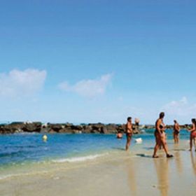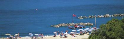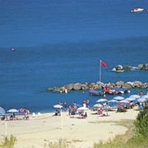 Z gruboziarnistym piaskiem (zalecane obuwie kąpielowe), hotelowa, około 350 m od obiektu.