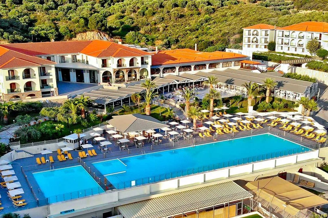Transfer z lotniska do obiektu trwa około 2 godziny. Obiekt znajduje się około 2,5 km od centrum Ouranoupoli. Rozległy kompleks położony jest na niewielkim wzniesieniu, otoczony piękną zielenią, na półwyspie Athos. Ouranoupoli to ostatnie świeckie miasteczko graniczące z Autonomiczną Republiką Góry Athos.
