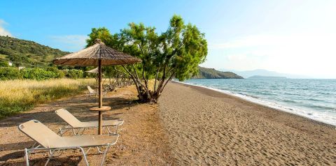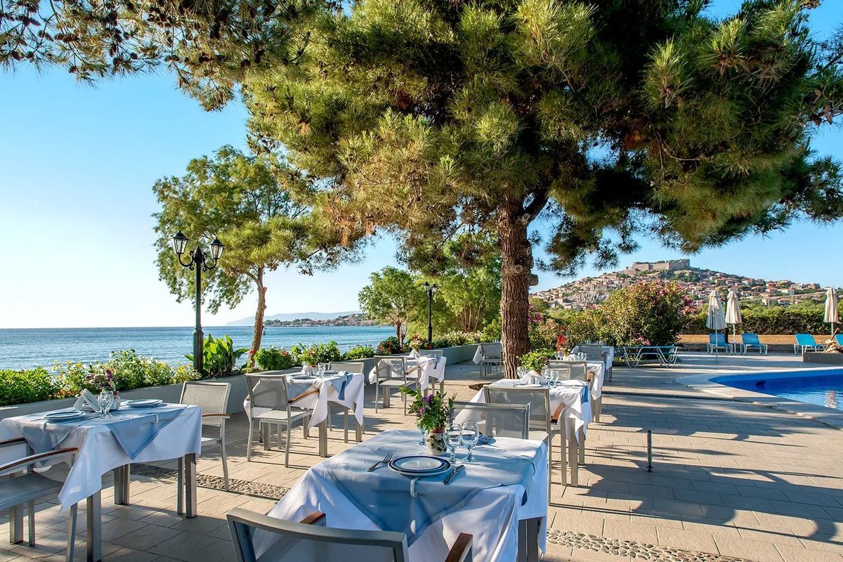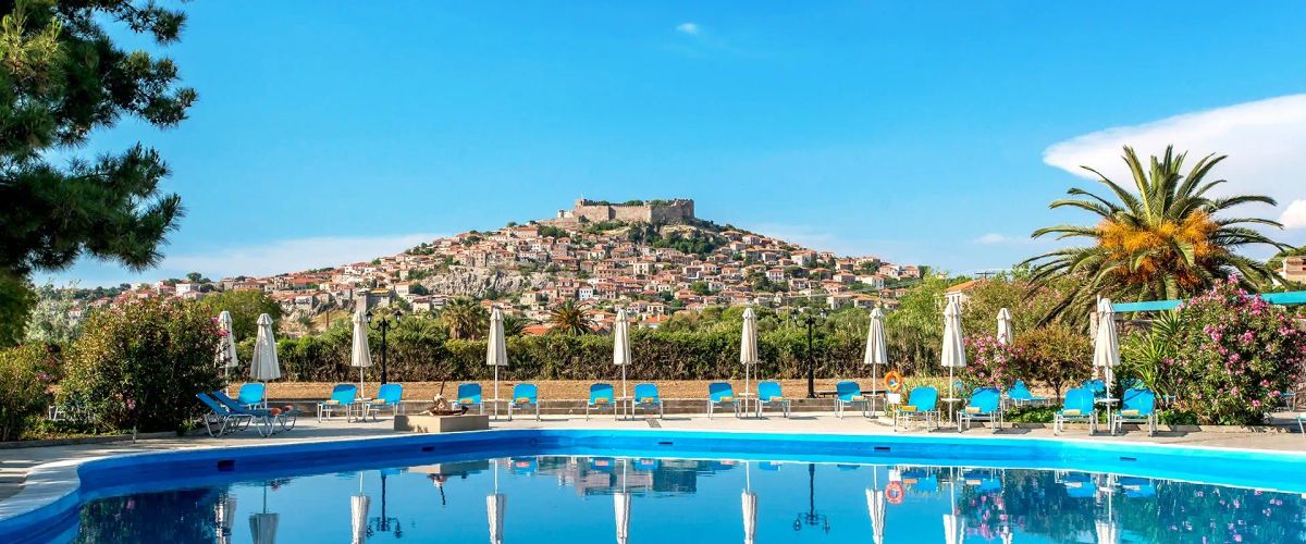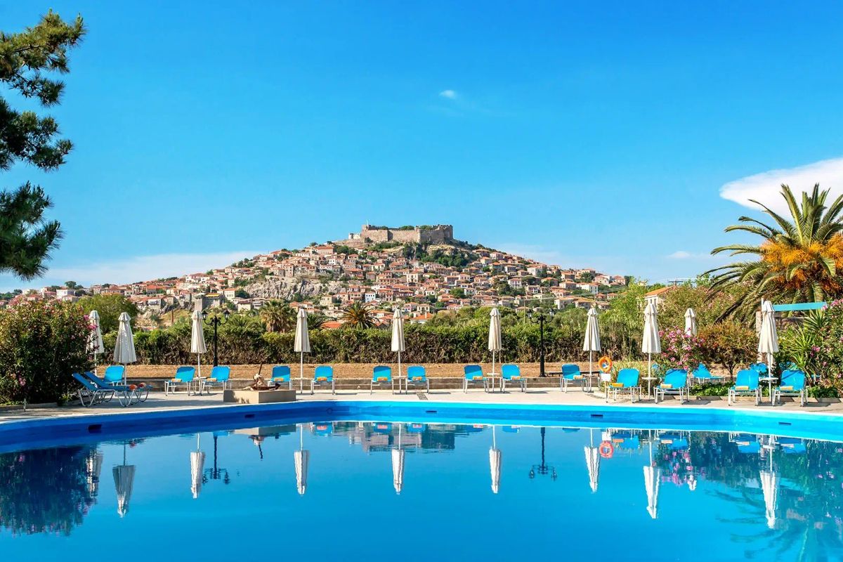 Hotel położony na rozległym, zielenie terenie, bezpośrednio przy pięknej piaszczystej plaży z bezpłatnym serwisem plażowym. Mimo dużej przestrzeni można poczuć jego kameralność, ale trzeba się też trochę nachodzić. Pokoje standardowe są wystarczająco duże, mogą mieć tylko jedną dostawkę, meble są proste ale ładne, jest czysto, tylko łazienka jest mała. W bungalowach pokoje są większe, jest większa łazienka, jest też aneks kuchenny. Mieszkając w bungalowach możemy bezpłatnie zamówić śniadanie do pokoju, tylko należy to dzień wcześniej zgłosić. Na terenie hotelu jest spory wybór atrakcji sportowych, jest plac zabaw dla dzieci. Z basenu można podziwiać piękne Molivos z twierdzą na wzgórzu. Jedzenie jest bardzo smaczne, właściciel stawia na jakość produktów z jakich są przygotowywane posiłki. Mimo, że jest to najstarszy hotel na wyspie, to właściciel stara się jak może, aby wszystko było jak należy i goście czuli się dobrze. Krótkim spacerem można dojść do Molivos, gdzie warto odwiedzić tawerny, gdzie można spróbować ich lokalnej kuchni.