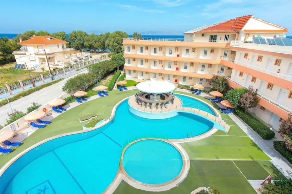 W północno zachodniej części wyspy, w spokojnej okolicy, ok. 2 km. od centrum niewielkiej miejscowości Kremasti, ok. 6 km od miasta Rodos, ok. 15 km od Doliny Motyli, ok. 50 km od Lindos. Przystanek autobusowy ok. 650 m. Port lotniczy oddalony o ok. 5 km.