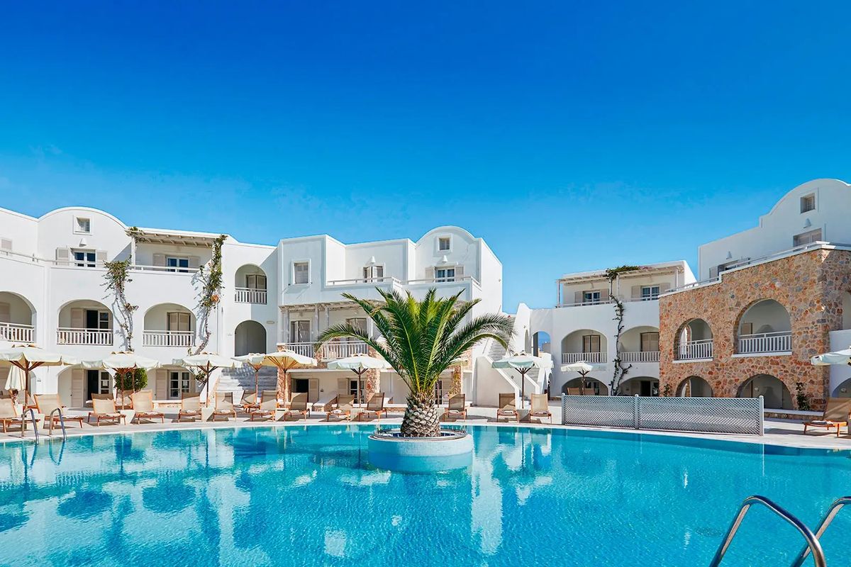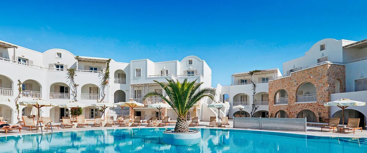 Oczarowuje piękną architekturą w stylu cykladzkim, idealnie harmonizującą z otoczeniem. Bardzo zadbany, z estetycznymi wnętrzami w tradycyjnej, pogodnej kolorystyce, wyposażony jest we wszystkie udogodnienia, gwarantujące udany pobyt. Komfortowe, nienagannie utrzymane pokoje, wszystkie są nieskazitelnie utrzymane i ładnie umeblowane, z lokalnymi akcentami. Centralnym miejscem hotelu jest piękny basen z barem, gdzie koncentruje się leniwe wakacyjne życie. Idealne miejsce także dla miłośników rozrywek - tylko parę minut spacerem do centrum Kamari, gdzie czekają bary, restauracje i tawerny, dyskoteki i sklepy. Jeszcze bliżej jest do popularnej czarnej plaży pochodzenia wulkanicznego.