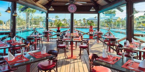 • 4 baseny, słona woda, podest do opalania w formie żaglówki przy basenie głównym: El Barco: pow. 1575 m², gł. 0,65 - 1,30 m