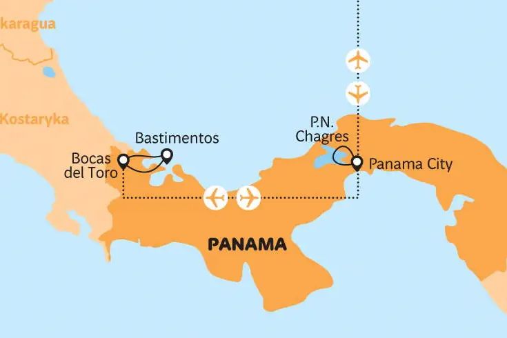 Panama City i Kanał Panamski wizyta w lesie deszczowym i rejs canoe rzeką Chagres spotkanie z Indianami Embera rajskie Bocas del Toro wyspa Bastimentos, Zatoka Delfinów i Plaża Czerwonej Żaby snorkeling i bajecznie kolorowe rafy koralowe bioluminescencja po zmroku wypoczynek na Karaibach