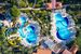 • 2 baseny, nieregularny kształt, słodka woda, ok. 905 m² i ok. 724 m², gł. 1,4 m, w większym basenie 4 zjeżdżalnie