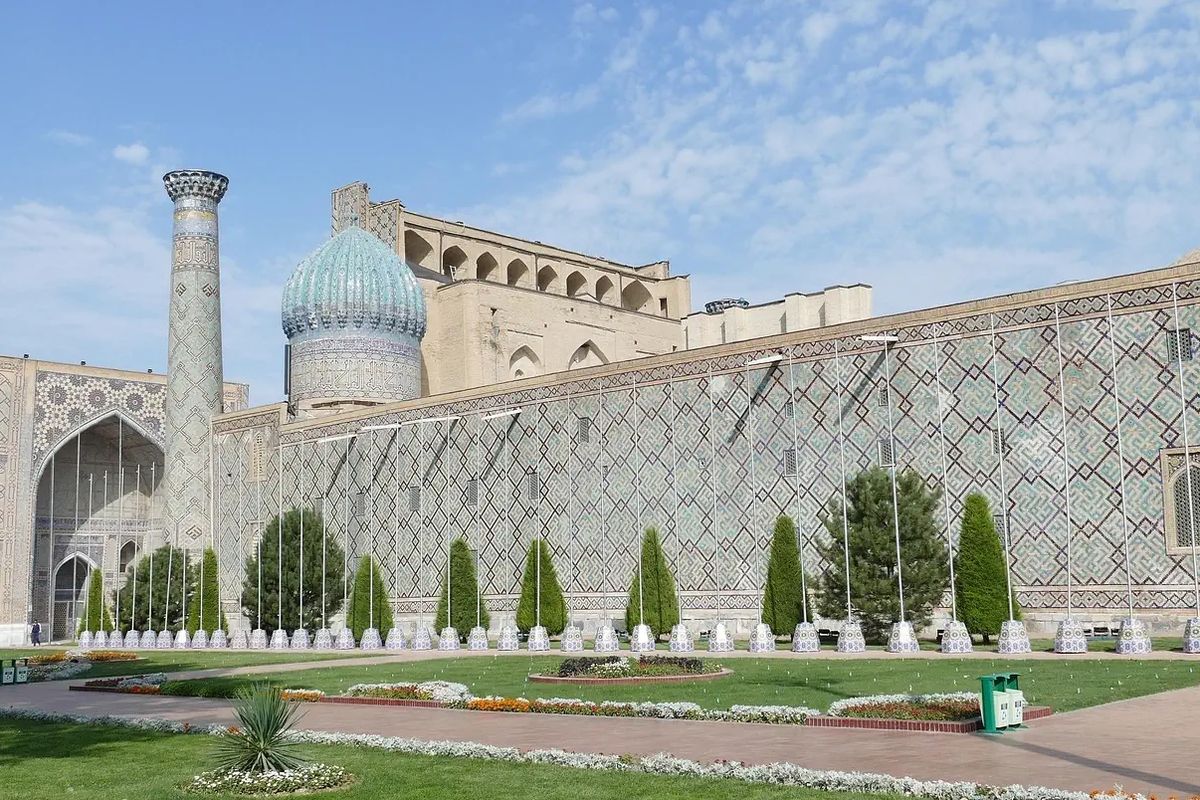 Transfer na stację kolejową i przejazd pociągiem ekspresowym do Samarkandy. Zwiedzanie stolicy imperium Timura. Ten okrutny najeźdźca, zwany też Tamerlanem i Żelaznym Emirem, z podbitych krajów sprowadzał do Samarkandy najlepszych artystów i rzemieślników, by zbudować tu stolicę na miarę swoich ambicji. Plac Registan otoczony jest trzema imponującymi medresami z XV-XVII wieku – Ulugh Beg, Tillia Kori i Shir Dor. Wizyta w meczecie z XV wieku, który Timur wystawił swojej ukochanej żonie Bibi Khanum. Następnie spacer po pobliskim bazarze, gdzie kupcy handlują lokalnymi warzywami i owocami, przyprawami oraz typowymi dla Uzbekistanu wyrobami ludowego rękodzieła. Kolacja.