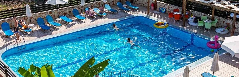 Hotel blisko morza w odległości 200 m 400 m do głównej ulicy Laganas hotel czysty basen wystarczający przy bliskości plaży