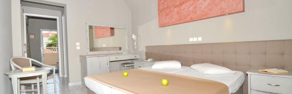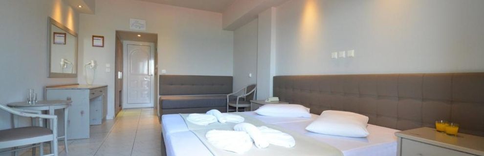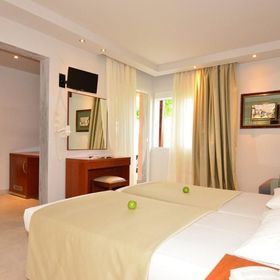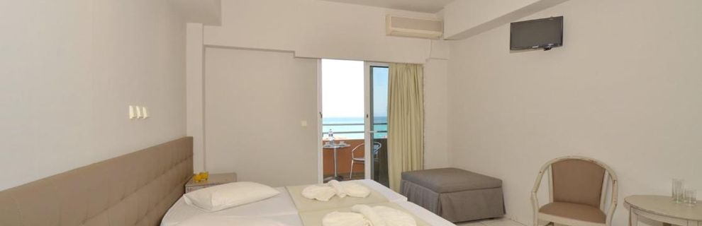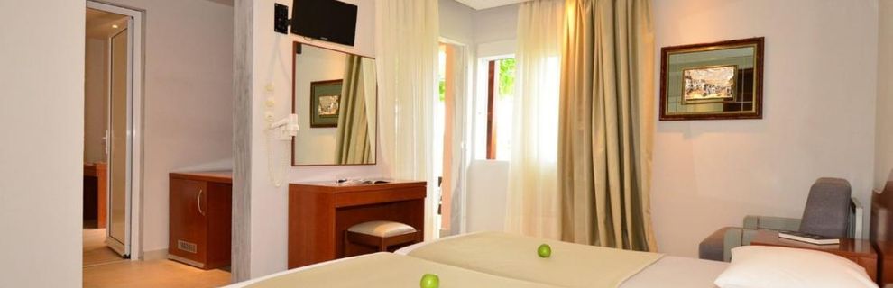 Otrzymaliśmy duży, przestronny pokój trzyosobowy na parterze z dużym balkonem (ale wiem, że są też małe pokoje). Pokój wyposażony standardowo, znajdowało się wszystko co potrzebne, łazienka również nie malutka z okienkiem. TV małe, ale to mało istotne, kanały głównie po grecku, rosyjsku, chyba tylko jeden informacyjny w j. angielskim. Ogólnie hotel przyjemny z pięknym dużym ogrodem. Restauracja zamknięta tzn. brak stolików na powietrzu, ale z widokiem na morze. Kuchnia bardzo smaczna, dania urozmaicone, raczej bardziej popularne niż luksusowe, bardzo nam smakowały desery, jednak to co jest serwowane zależy od pory roku. My zwolennicy zdrowej diety byliśmy zadowoleni. Hotelowy basen przy samej plaży, czysty, ale przez nas sporadycznie użytkowany skoro tuż, tuż jest plaża, raczej czysta, piaszczysto-kamienista (można ostrożnie chodzić boso), niestety płatna, ale krajobraz i wypoczynek bezcenne.