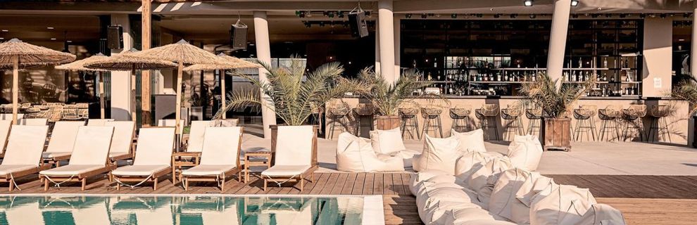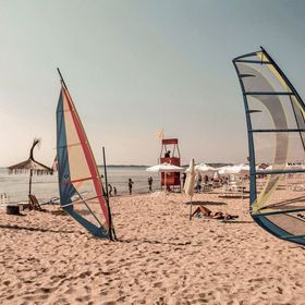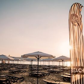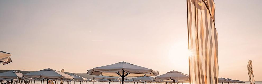 Szeroka plaża z licznymi barami i leżakami