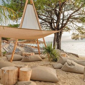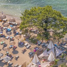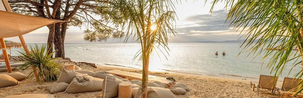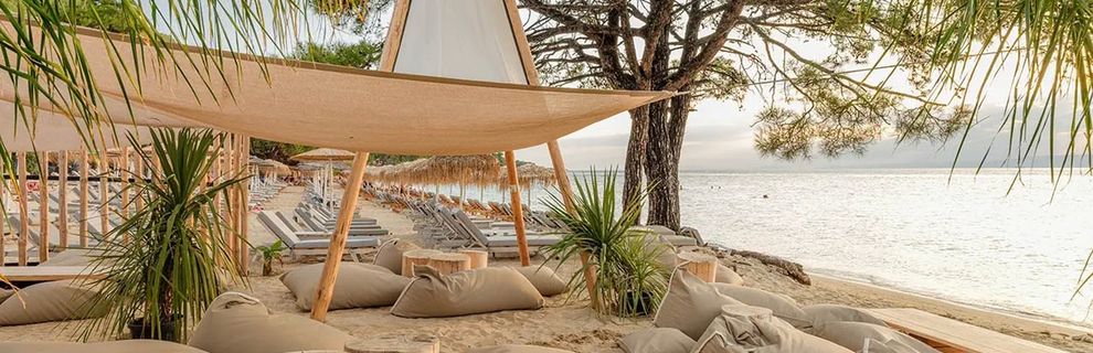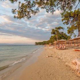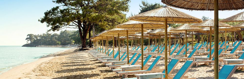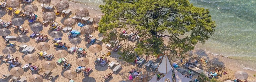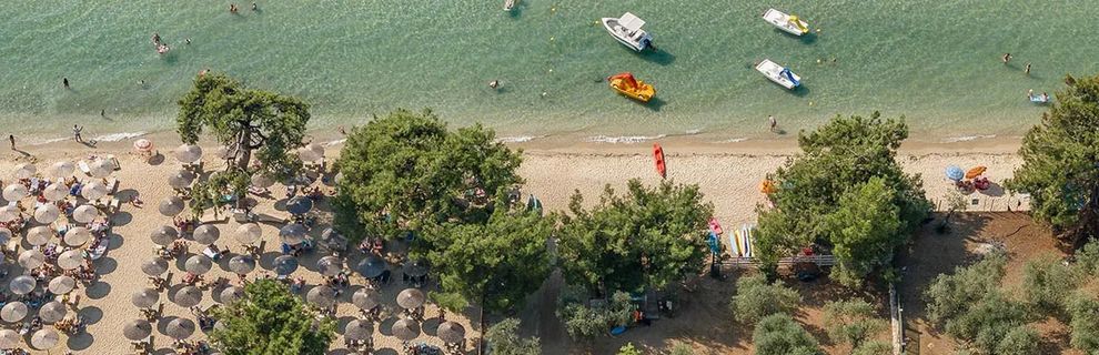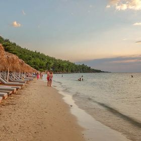 przy łagodnej piaszczystej plazy, pośród gór porośniętych lasami sosnowymi, bardzo dobre jedzenie