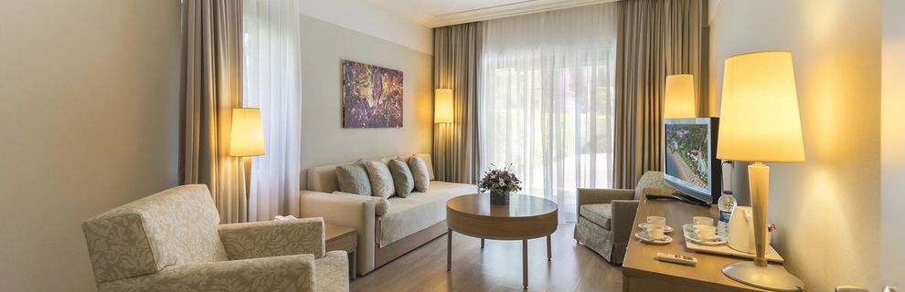 Polozony w lesie na dużym zadbanym zielonym terenie, Sam hotel nie jest najnowszy, ale jest czysto, przyjemnie. Druga część pokoi jest w willach na terenie ogrodu. Pokoje sprzątane codziennie, ręczniki wymieniane codziennie, chociaż osobiście uważam ze co drugi dzień spokojnie by wystarczyło, barek uzupełniany rownież codziennie. Pokój z widokiem na ogród. Dobry wybór, bo było cicho i przyjemnie. Klimatyzacja bez zarzutu. Personelu jest tak duzo że nie jestes w stanie zapamiętać każdego, ale wszyscy są uprzejmi, pomocni, zawsze uśmiechnięci. Wyżywienie: Posiłki bardzo urozmaicone, duzy wybór zarówno na ciepło jak i na gorąco. Ciekawe dania są też przygotowywane na stoiskach na zewnątrz, duzy wybór deserów, owoców. Nie ma opcji żeby ktoś czegoś dla siebie nie wybrał. Wielki plus za nocny bufet. Szczególnie istotny dla przybywających w nocy urlopowiczów Dodatkowo popołudniowy bar w części z basenami z gorącymi daniami. Kawiarenka z ciastkami, lodami i goframi. Wszędzie kelnerzy. Ponadto barki z napojami przy basenach.. A co do basenów: sa dwa, główny przed hotelem, najbardziej oblegany, tutaj odbywaja sie animacje wiec wczesnie miejsca sa zajete. Drugi basen z dwoma zjeżdżalniami jest troche dalej. Długa, piaszczysta plaża, leżaki zawsze dostępne. A jeżeli ktoś woli „plażować” w trawie to tez ma taką możliwość. Dodatkowo leżaki sa rownież na molo. Wejście do morza- trzeba uważać bo niestety jest troche kamieni. Warto zabrać buty do wody. Wszędzie są ratownicy. Wieczorem atrakcje: koncerty, pokazy tancerzy, cyrkowców. Na terenie hotelu są też sklepy, fryzjer/barber. Mimo wielkości i ilości gości, nie czuje tłoku, na plaży znajduje sie tez wypożyczalnia skuterów, motorowek, można „polatac”ze spadochronem. Polecam miejsce