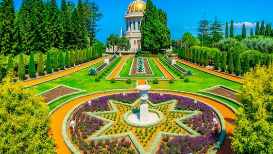 Ogrody Bahaitów tarasowo schodzące ku portowi i morzu