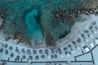 Plaża u podnóża wzgórza z tawernami
