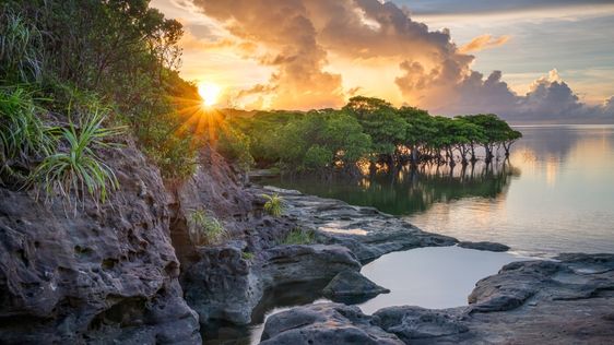 Tropikalne krajobrazy z bujną roślinnością, w tym lasy mangrowe i rafy koralowe